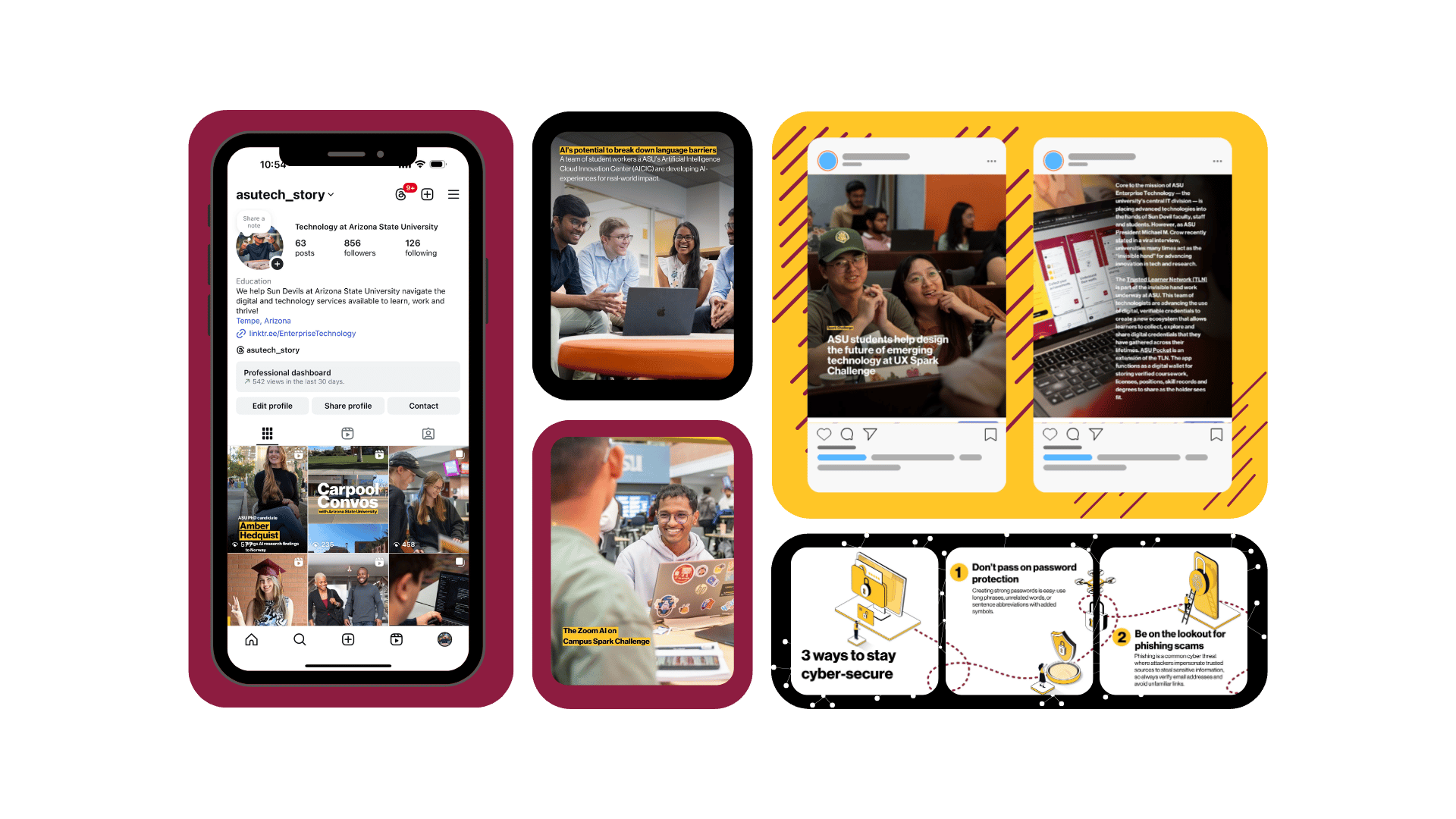 As lead designer, I developed the visual identity and content strategy for ASU Enterprise Technology’s Instagram presence. I created graphics, edited videos, and managed post scheduling while collaborating on campaign concepts and storytelling. The result is a cohesive, engaging brand presence that highlights the department’s innovation and community impact.